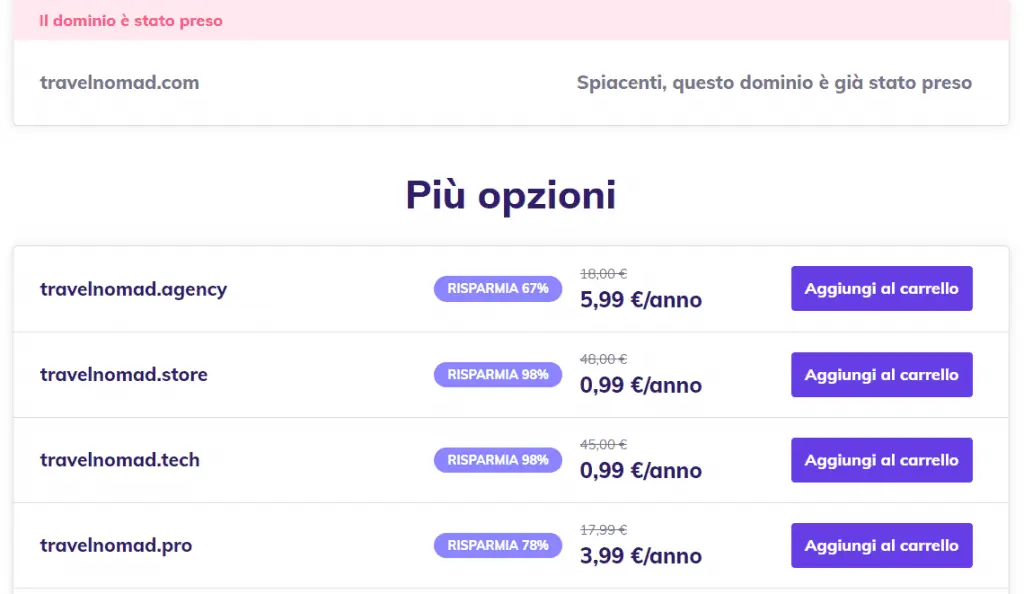 Se vuoi un dominio già occupato, devi negoziare con l’attuale proprietario. In alternativa, scegli un’estensione diversa o inventati un altro nome.