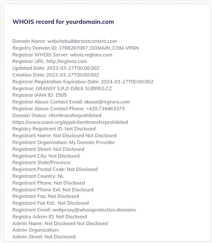 Quando si registra un dominio, il WHOIS memorizza i tuoi dati personali, come il numero di telefono, l’indirizzo di casa, il nome del dominio, l’indirizzo IP e la data di scadenza. Poiché le informazioni sono pubblicamente disponibili, il tuo sito potrebbe essere soggetto a furti di identità, phishing via email e attacchi di spam.
