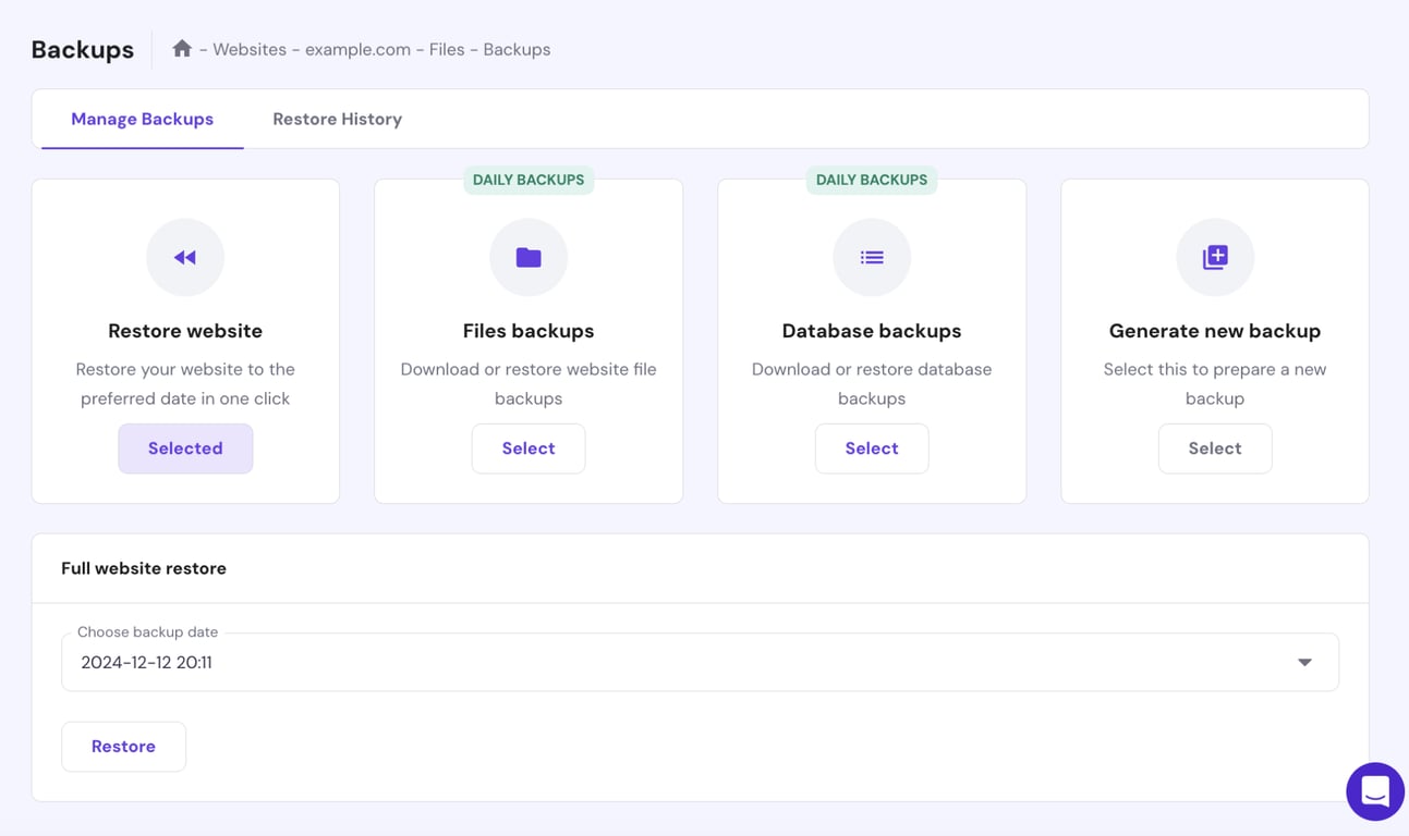 例えば、Hostingerのマネージド型のレンタルサーバープランでは、サイト管理者の手間を省く自動バックアップ機能を標準装備しており、Premiumプランなら週1回、BusinessプランとCloudプランなら毎日自動的にバックアップが作成されるので安心です。