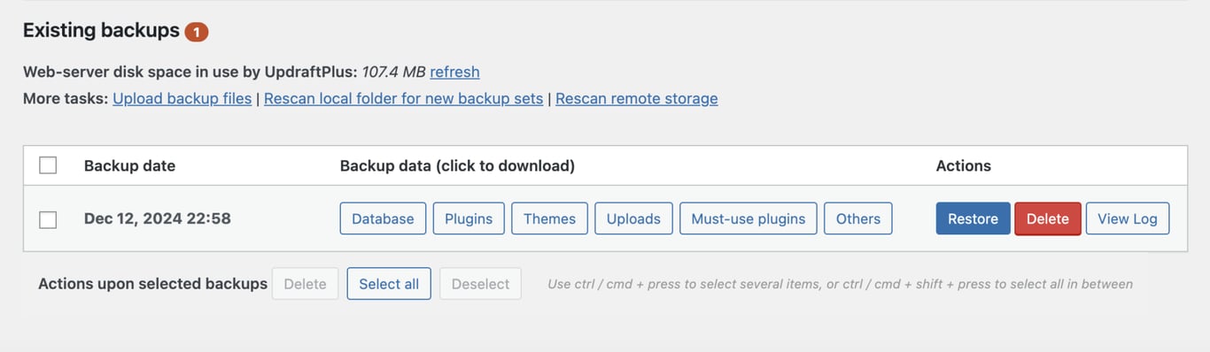 サイトの規模やデータ量によっては処理に数時間かかることもありますが、完了すればWebサイトのファイルとデータベースの完全なバックアップが作成されます。バックアップの確認はWebサイトの完全な復元セクションの下にある最新のバックアップタイムスタンプをチェックすれば一目瞭然です。