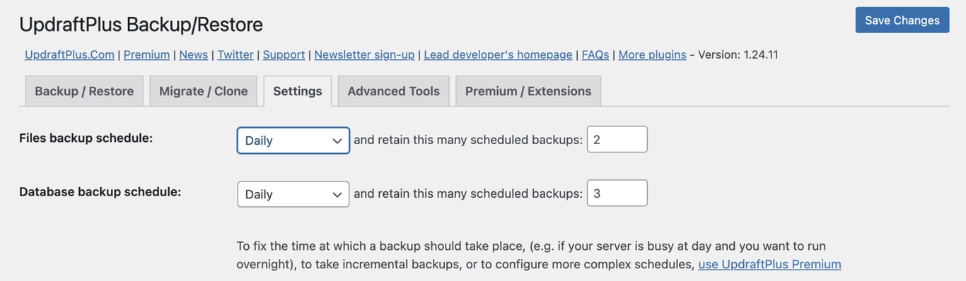 UpdraftPlusで自動バックアップをスケジュールしたい場合の設定方法は以下のとおり。