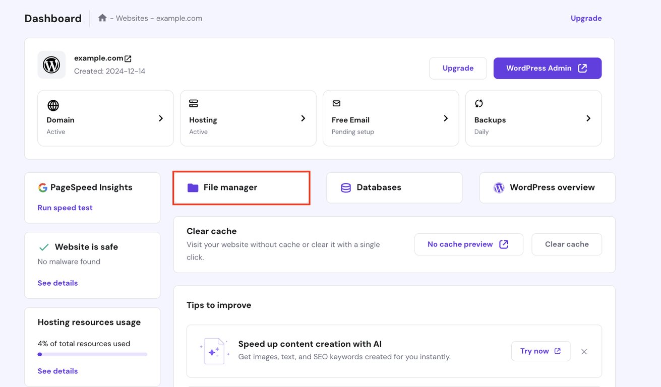ほとんどのレンタルサーバーのコントロールパネルにはファイルマネージャー機能が標準装備されています。サービスによってデザインは違っても、基本的な操作方法は似ています。Hostingerのファイルマネージャーを使ったステップは以下のとおり。