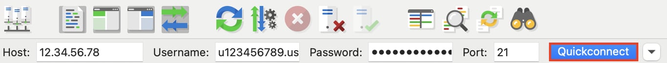 - hPanelで確認したFTP情報をFileZillaの各欄に入力し、「クイック接続」をクリック