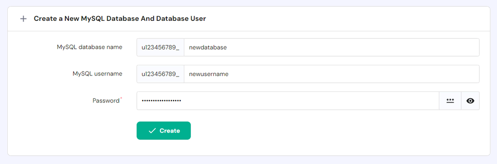 - 新しいMySQLデータベース名、ユーザー名、パスワードを入力し、データベースを作成をクリックします。