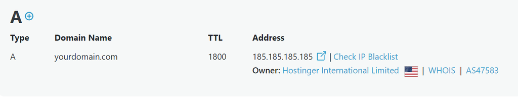 Aレコードを設定するには、まずオンラインDNSルックアップツールでドメイン名のAレコード値を確認します。次に、ホスティングアカウントでサーバーのIPアドレスを調べます(Hostingerの場合は、プランの詳細ページに記載されています)。