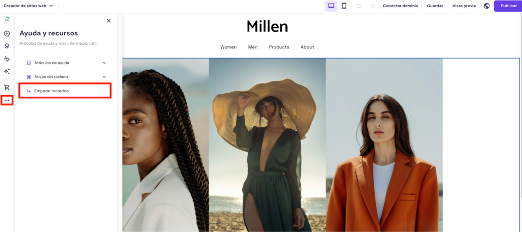 Si lo necesitas, puedes hacer un recorrido por el constructor haciendo clic en la página de configuración del sitio web marcada con tres puntos horizontales. A continuación, haz clic en Ayuda y recursos → Empezar recorrido.