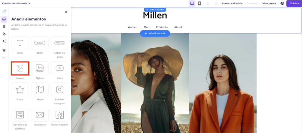 - Haz clic en Añadir elementos en la barra lateral izquierda. Asegúrate de que estás en la página o sección a la que quieres añadir fotos.