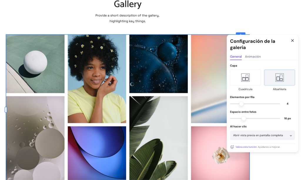 - Ajusta el diseño, los elementos por fila y la animación de la galería según necesites.