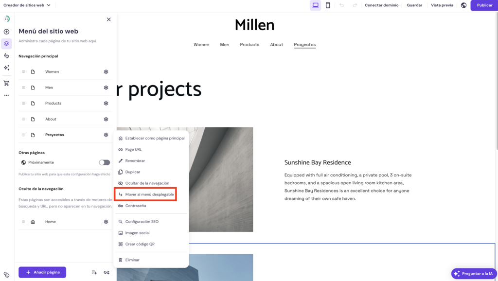 Para crear un desplegable, simplemente arrastra la página Proyectos a una de las páginas existentes. Haz clic en Mover al menú desplegable.