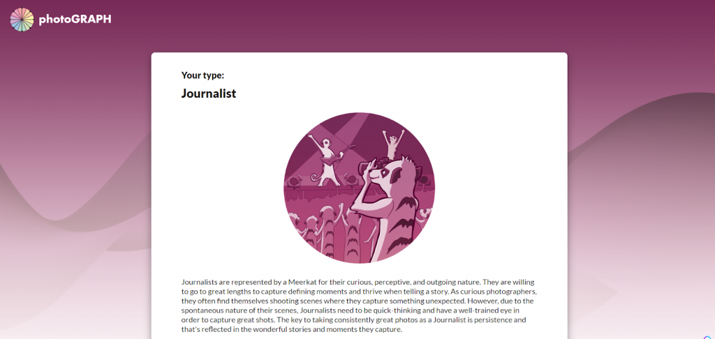 photoGRAPH es una gran herramienta para conocer mejor tus puntos fuertes e intereses. Este cuestionario online ayuda a identificar el enfoque adecuado que se alinea con las fortalezas naturales de los fotógrafos, incluyendo los temas más adecuados, el estilo fotográfico y el método de planificación. También proporciona consejos para mejorar sus habilidades.