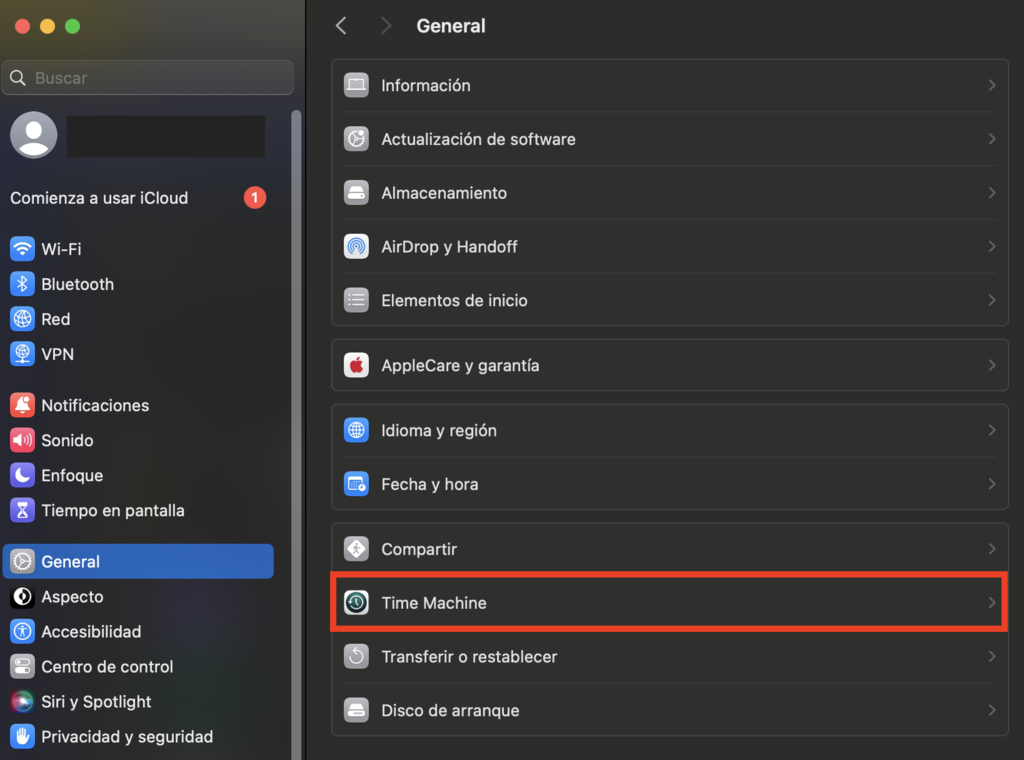 - Navega hasta Configuración del sistema → General → Time Machine.