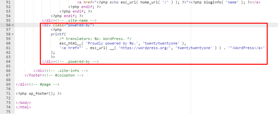 El código del pie de página varía en función del tema. Para la mayoría de las plantillas por defecto, el código de crédito está disponible en footer.php. Por ejemplo, el código del tema Twenty Twenty tiene este aspecto: