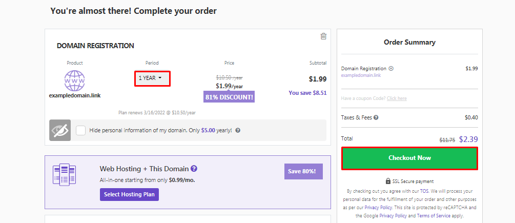 You can see that you can get a cheap domain registration with as little as $0.99. The offer includes some relatively new domain name extensions, such us .online, .shop, or .tech domains. There are many more extensions to choose from that are not listed here, such as .site and .store domains. To check out whether the extensions you want are available, simply access our domain name checker. You might also want to check out some of the options to get a free web domain.