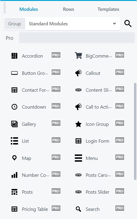 - Pro modules – more comprehensive modules useful to create a business page, including contact and login forms, CTAs, and BigCommerce products.
