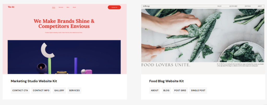 - Template kits – a set of templates containing different page elements to build a complete site structure.
