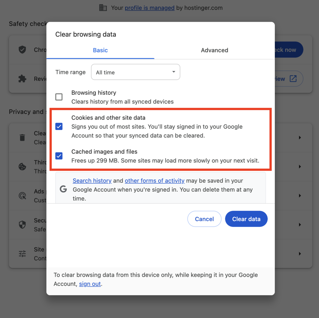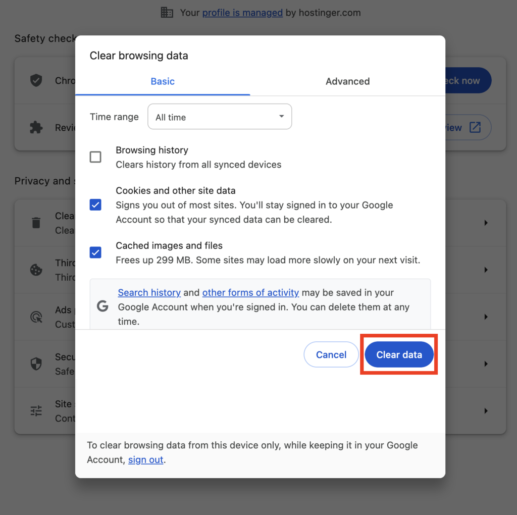To delete the cached data and browser cookies, go to your browser’s settings and find the option to clear them. If you use Google Chrome, follow these steps:
