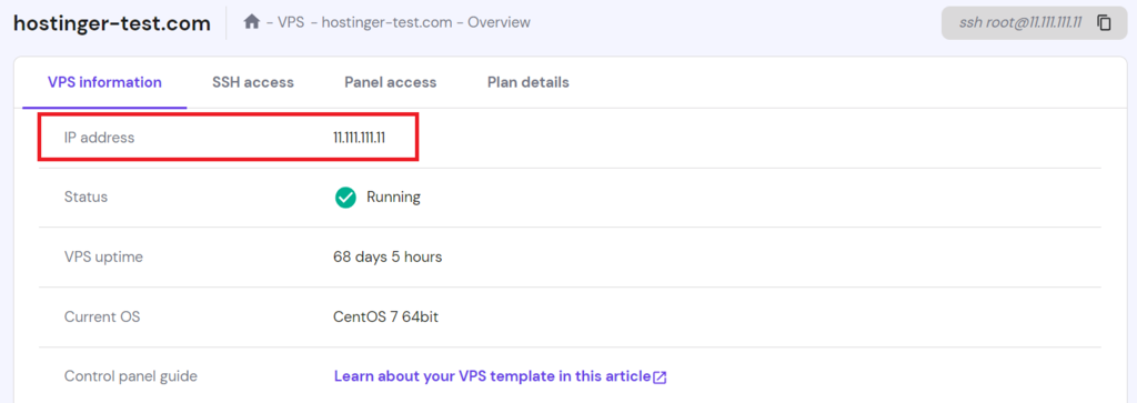 Once installed, enter https://example:8443 in your browser’s address bar to access your Plesk control panel. Replace example with your server’s domain or IP address. This information is available in the Overview tab of your VPS management dashboard.