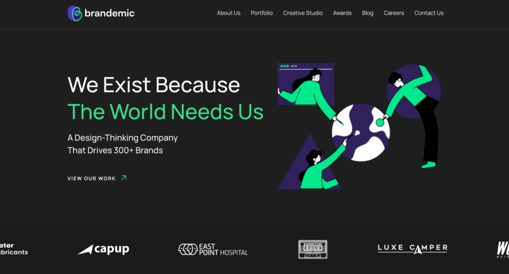 Brandemic’s website stands out for its design-thinking and behavior-driven approach to branding and design strategies. The homepage introduces the team’s unique perspective on marketing, and the portfolio showcases the agency’s diverse range of services.