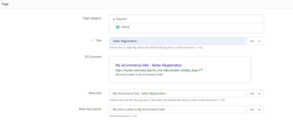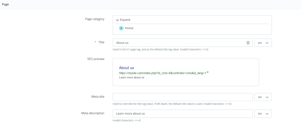 Important! Check the SEO preview to see how the meta title and meta description will appear on search engine results pages. Don’t include the characters ,=,{, or } in these two elements, or they will be considered invalid.