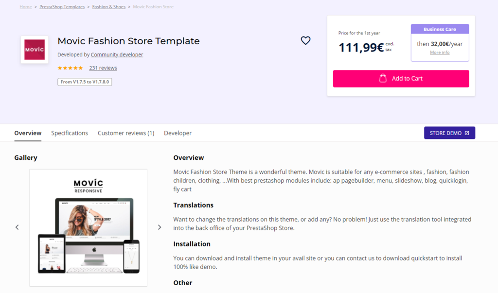 - It will take you to the PrestaShop Templates page on PrestaShop’s Official Addons Marketplace. The themes are organized by various characteristics, such as shop category, PrestaShop version, or included functionalities. Simply click on any theme to see its features and demo.