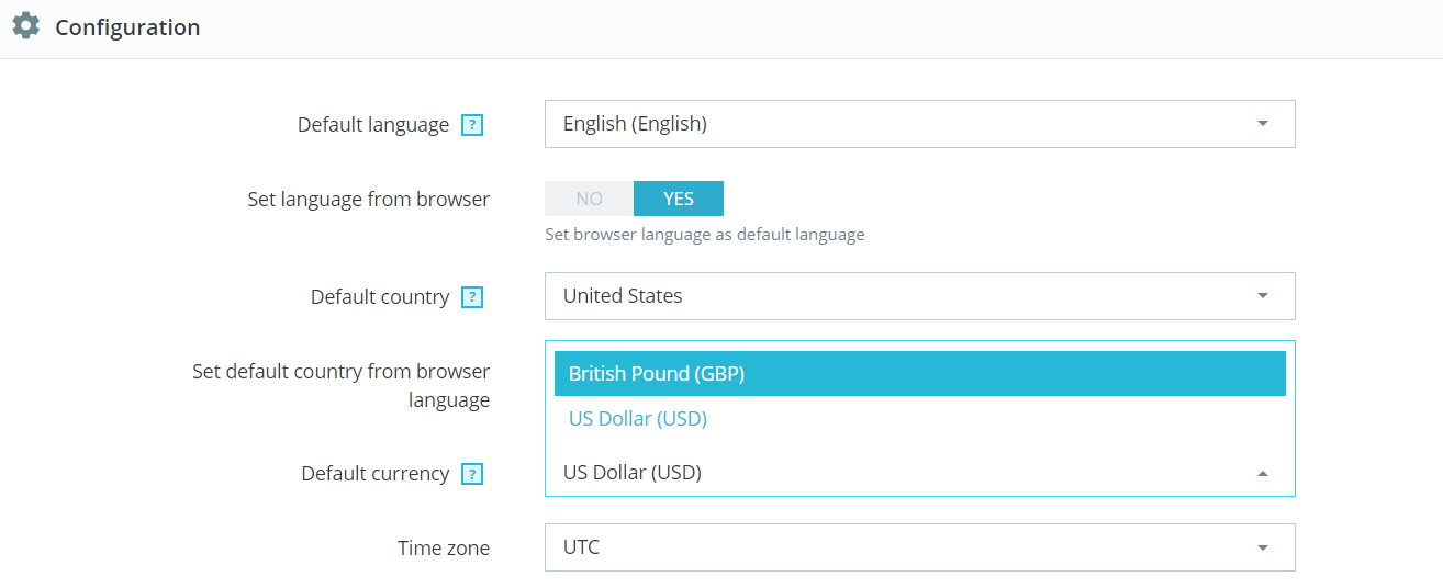 To set a new default currency, navigate to International → Localization and head to the Configuration section. Click on the Default currency drop-down menu and choose the desired currency. Click Save.