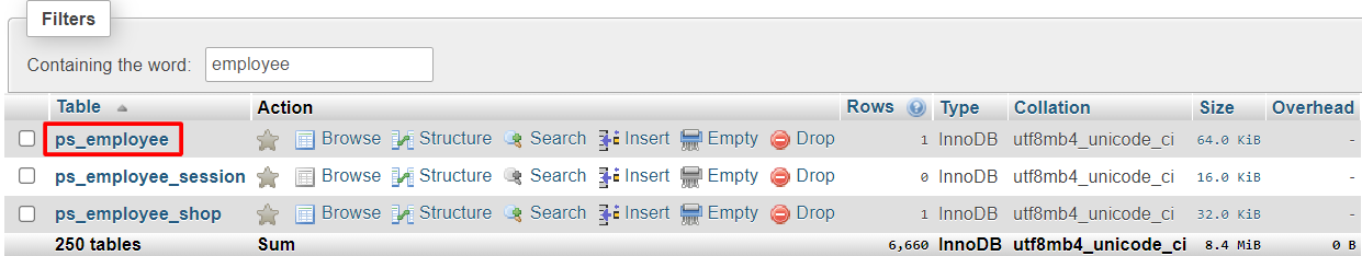 - Type in employee on the filter bar and select the (prefix)_employee table. The default prefix is ps.