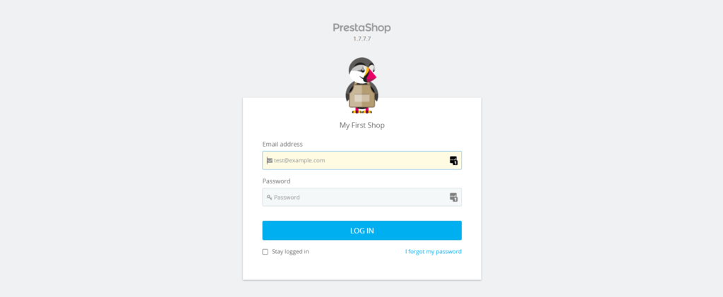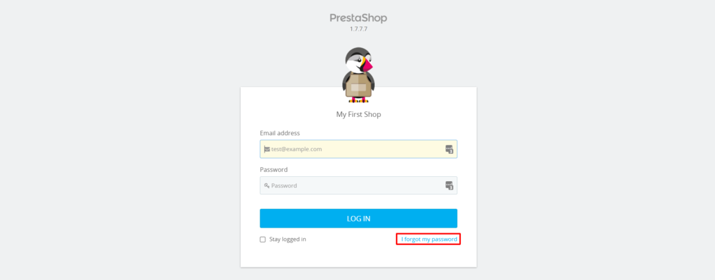 - Go to PrestaShop’s login panel and click I forgot my password.