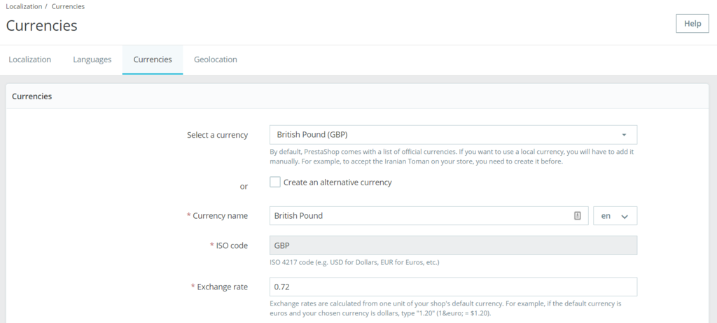 - Choose the currency you want to add and fill in the exchange rate calculated from your current default currency. In this example, we’re adding the British Pound (GBP), while the current default currency is the United States Dollar (USD).