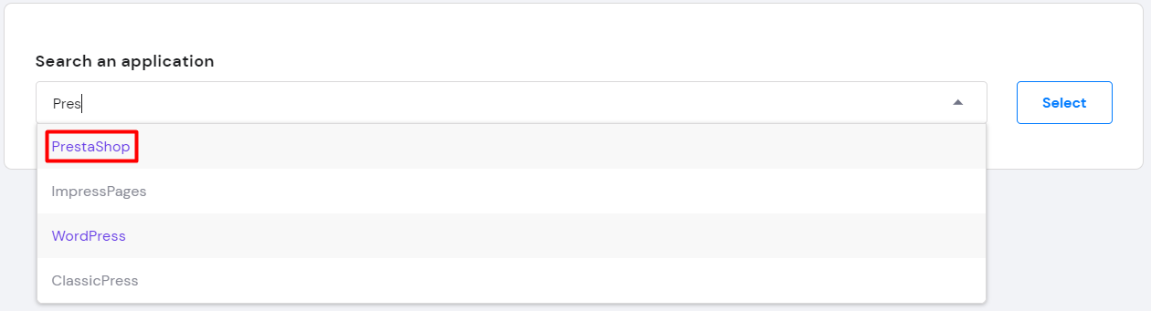 - The Search an application section will appear. Type PrestaShop into the search bar, and click the Select button.