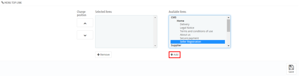 - On the left, the Selected Items column shows what’s already on the menu. The Available Items column contains pages available in your shop. Move the page you just created – in this example, Seller Registration – and click Add to move it to the Selected Items column. Then, hit the Save button.