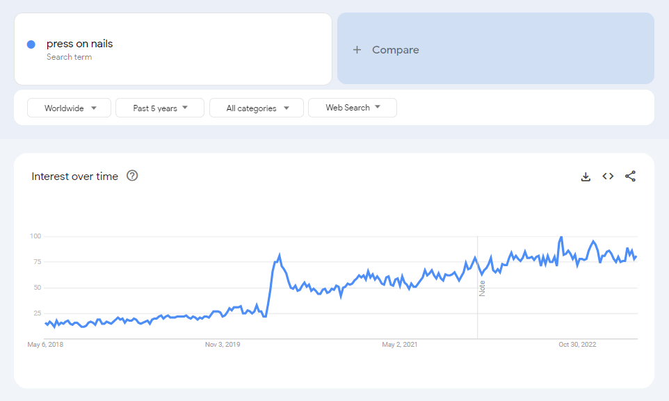The global Google Trends data of the search term "press on nails" for the past five years.