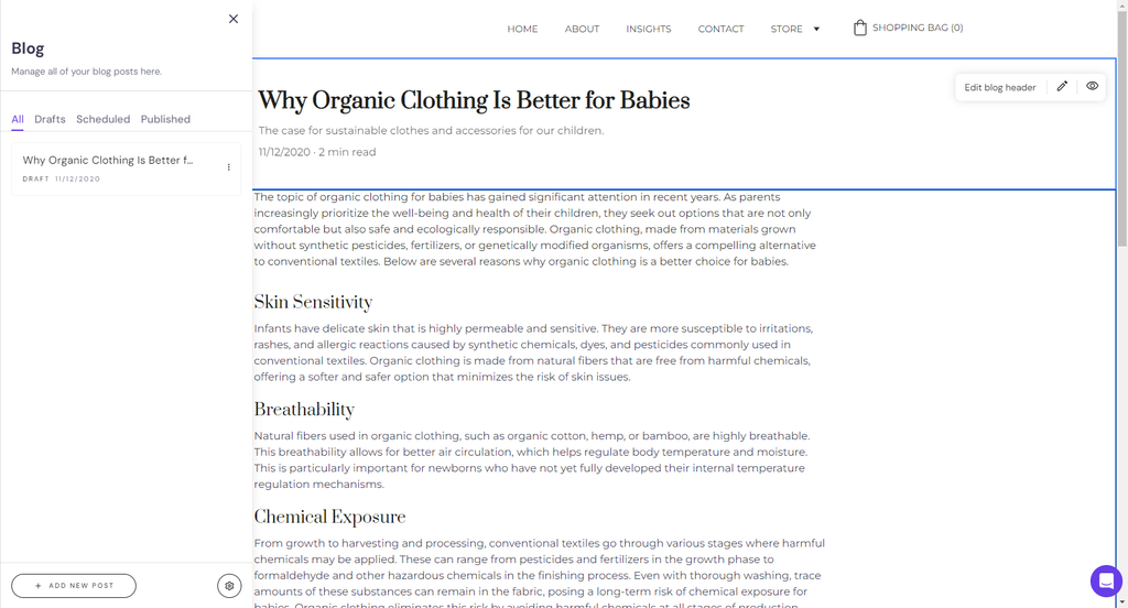 Other than that, the integrated blogging tools make it easy to create drafts, schedule posts, and adjust SEO settings like URLs and meta descriptions. All of this is accessible from the drag-and-drop builder to streamline your workflow.