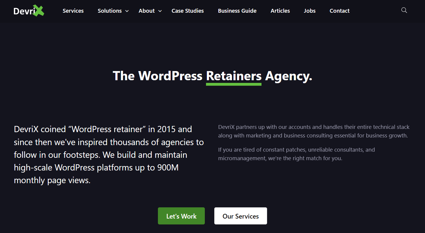 • DevriX. As one of the best WordPress agencies providing retainer solutions, it offers regular audits and continuous development, ensuring optimal site health.
