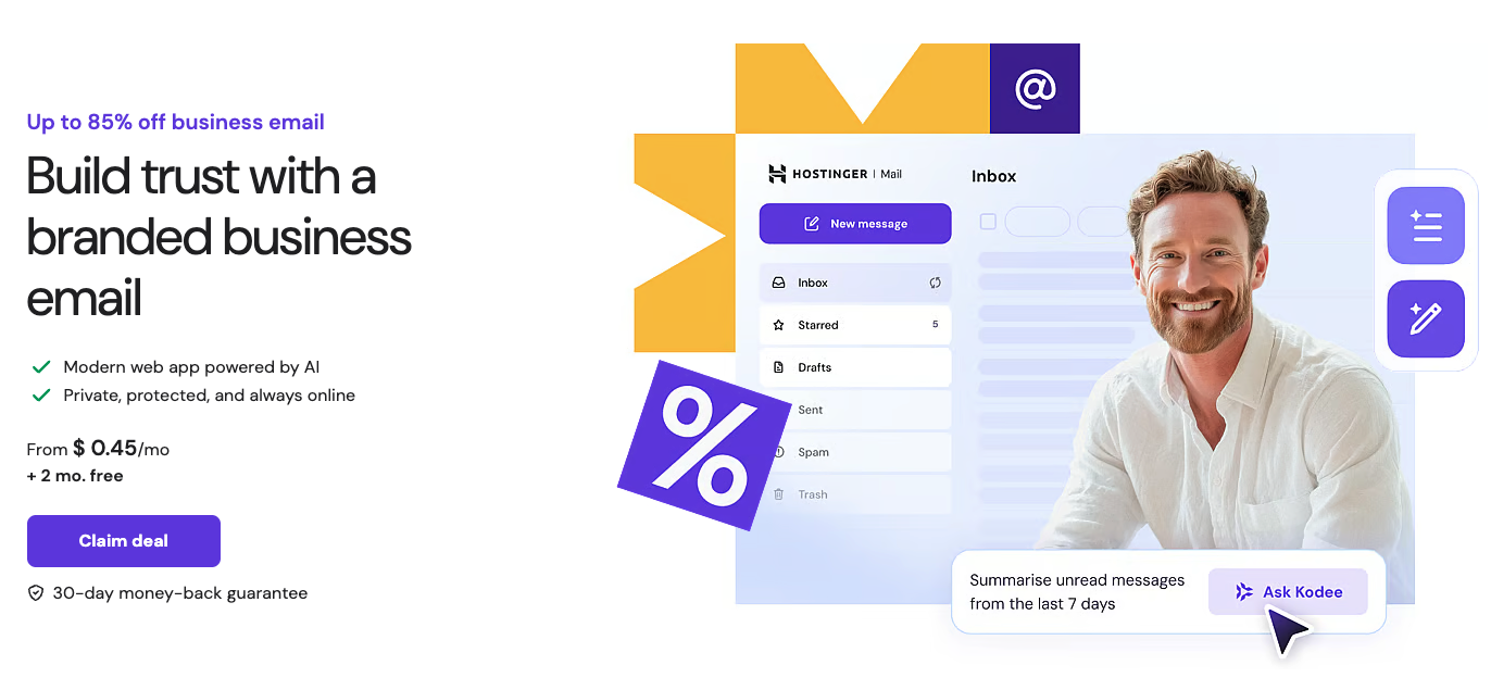 Hostinger is one of the most cost-effective email hosting providers that caters to small businesses and entrepreneurs. Despite the low starting prices, Hostinger provides robust features to create a business email.