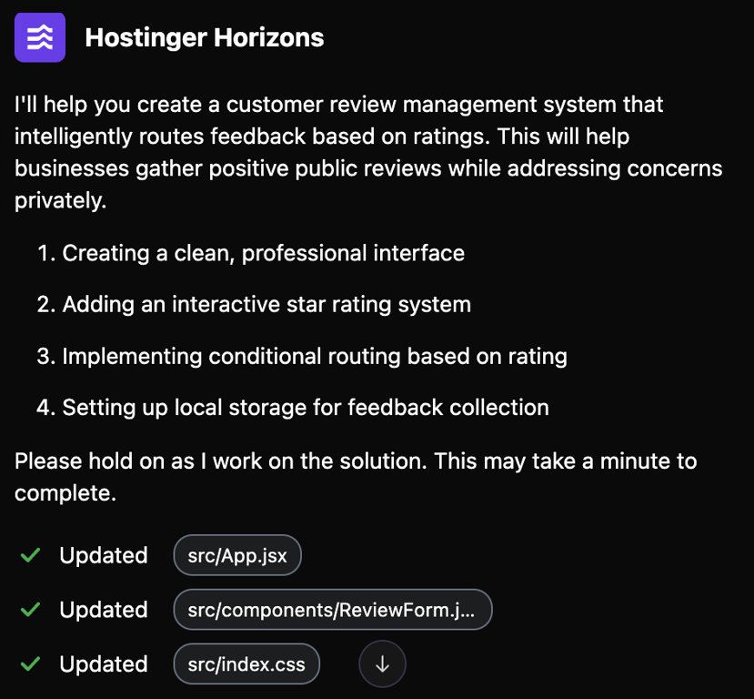 Once you’ve entered your prompt, Hostinger Horizons will analyze your request and generate the full site, with suggestions on how to improve it.