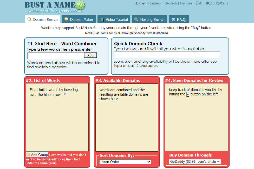 Bust a Name heeft twee tools voor het vinden van de beste ideeën voor domeinnamen – Domain Search en Domain Maker, bovenaan op de startpagina.