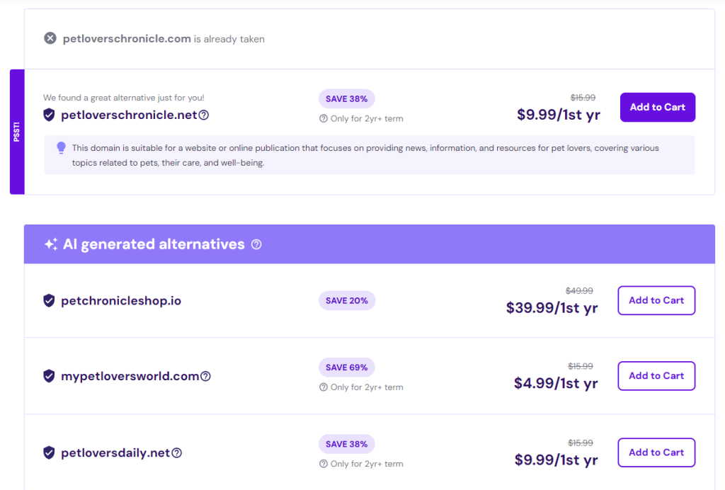 Laten we petloverschronicle.com als voorbeeld nemen. Omdat de naam niet beschikbaar is, zal de domein zoekfunctie namen met verschillende TLD’s voorstellen, zoals petloverschronicle.net. Bij Hostinger ontvang je ook AI-gegenereerde suggesties met aangepaste keywords.