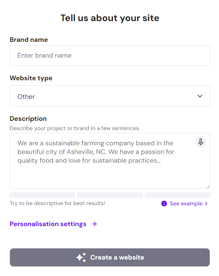 - Voer de gegevens van je merk en het type website in. Wees zo beschrijvend mogelijk en help AI begrijpen wat je nodig hebt. Verruim de Personalisatie-instellingen en stel je voorkeursstijl en kleurenpalet in, in plaats van dat je deze willekeurig gebruikt. Als je klaar bent, klik je op Website maken.
