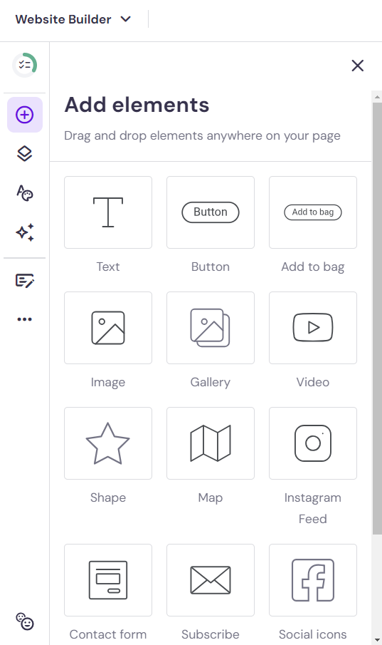 - Om een nieuw element toe te voegen, klikt je op de knop (+) in de zijbalk en drag-and-drop je een element uit de beschikbare opties naar de editor.