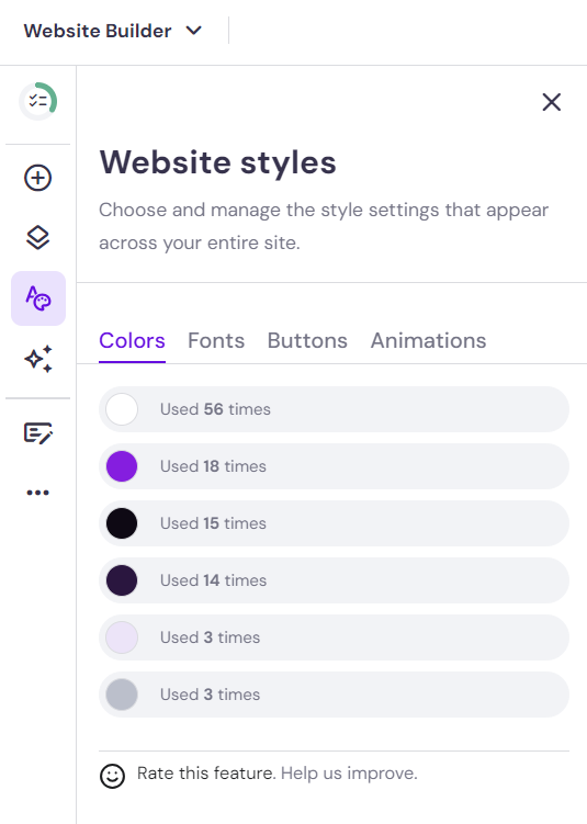 - Ga naar Websitestijlen om algemene wijzigingen aan te brengen in het uiterlijk van je website. Met deze instelling kun je de kleuren in het palet, de verschillende tekststijlen, knoppen en animaties voor de elementen instellen.