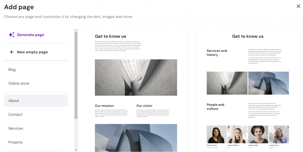 - Kies één van de kant-en-klare pagina-templates en maak een lege pagina of gebruik AI om een eigen pagina te genereren. Voor deze tutorial gebruiken we Pagina genereren met AI.
