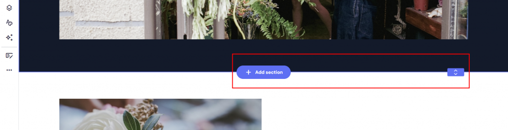 - De nieuw aangemaakte pagina wordt geleverd met verschillende secties en hiermee kun je direct aan de slag gaan. Beweeg met de muis tussen de al aanwezige secties en klik op Sectie toevoegen wanneer je een nieuwe sectie wilt toevoegen met behulp van een kant-en-klare sectie template of AI. Beweeg de Sectie-hoogte balk, naast de knop voor het toevoegen van secties, naar boven of beneden, om de hoogte van ieder onderdeel aan te passen.
