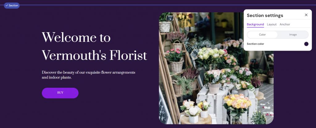 - Klik op een sectie en de werkbalk wordt weergegeven. Hiermee kun je de achtergrond, lay-out en volgorde wijzigen.