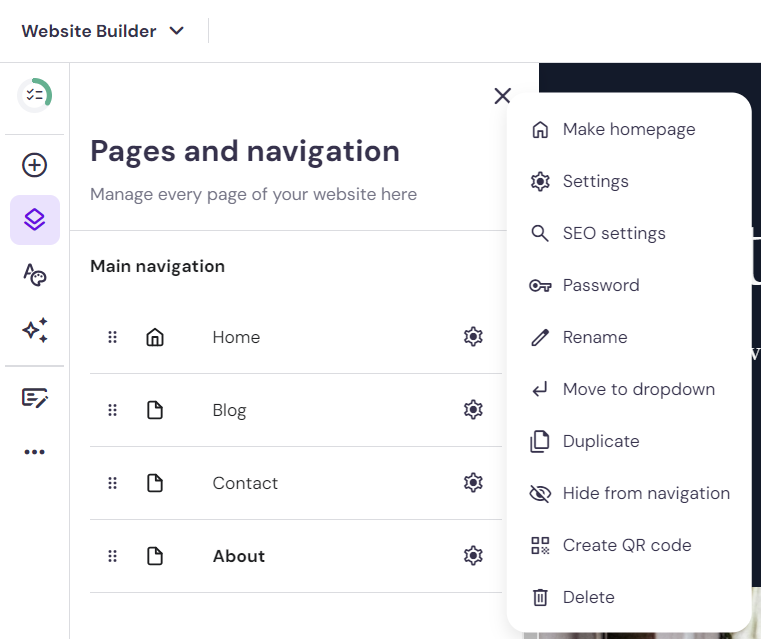 - Als je tevreden bent met het ontwerp van de pagina, ga dan terug naar Pagina’s en navigatie en configureer de instellingen. Gebruik het tandwiel pictogram naast je nieuwe pagina voor andere opties, zoals de startpagina instellen, een wachtwoord toevoegen, een QR-code genereren of de pagina verbergen uit de navigatie.