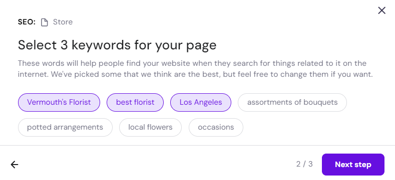 - Het platform geeft keywords voor de ranking van je pagina op basis van de paginabeschrijving. Selecteer drie keywords voor je pagina en klik op Volgende stap.