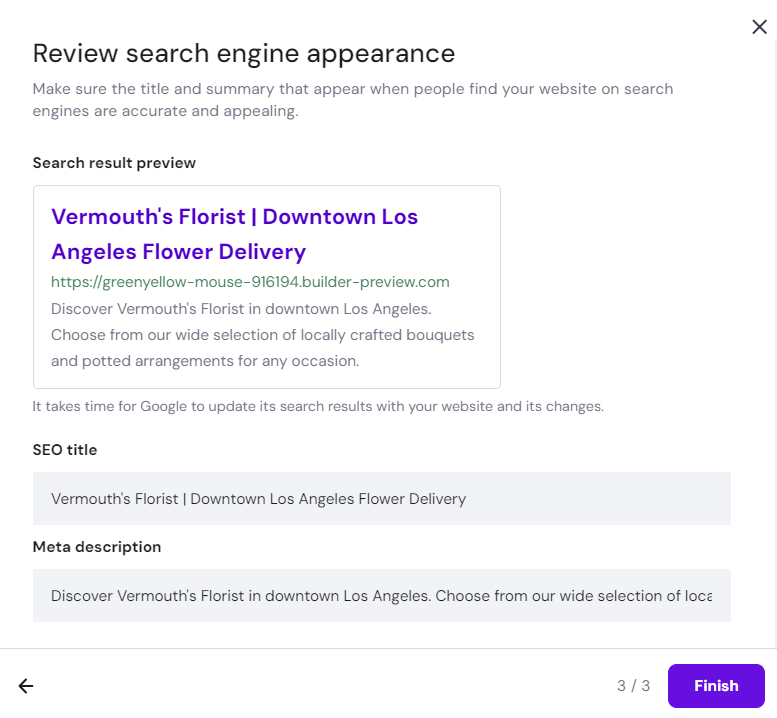 - De laatste stap is het verfijnen van de SEO-titel en meta-beschrijving van de pagina. Deze zullen zichtbaar zijn in de zoekresultaten. Als je tevreden bent met het voorbeeld, klik je op Voltooien.