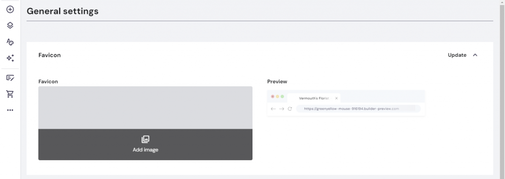 - Ga terug naar Website-instellingen en ga vervolgens naar Algemene instellingen. Open de sectie Favicon en klik op Afbeelding toevoegen. Dit pictogram verschijnt naast de titel van de pagina in het browsertabblad, dus ons advies is om een eigen logo-ontwerp te gebruiken voor een betere zichtbaarheid van jouw merk.