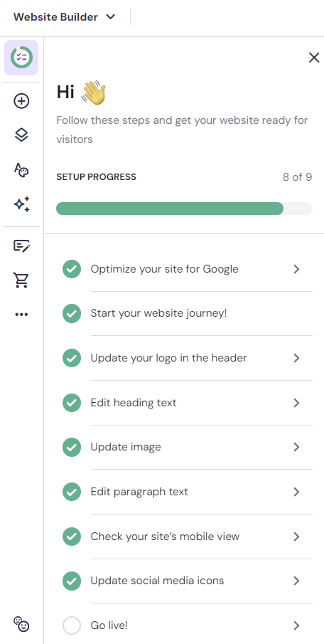 We hebben nu alle basisstappen voor het maken van een website met de website bouwer van Hostinger doorgenomen. Open de Website configuratie checklist in de zijbalk voor de resterende taken, zoals het aanpassen van het webontwerp voor mobiele weergave en het toevoegen van links naar sociale media.