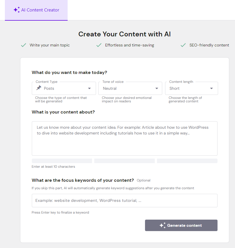 Hostinger-gebruikers met Business Hosting en Cloud Hosting plannen krijgen de AI-assistent vooraf geïnstalleerd voor gestroomlijnde contentcreatie en -import. Deze in-house plug-in helpt je om berichten en pagina’s aan te passen aan de door jou gewenste intonatie, lengte en keywords.