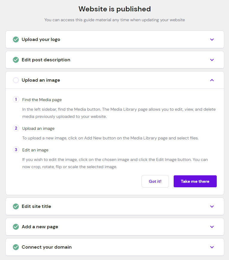Ga naar Hostinger → Aan de slag op het beheerderspaneel voor alle stappen voor het instellen van de website die je misschien over het hoofd hebt gezien. Als er nog een stap niet voltooid is, open deze dan en selecteer Breng me erheen als je er iets aan wilt doen.